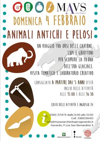 L'appuntamento fisso del MAVS: ogni prima domenica del mese con visite tematiche e laboratori per i ragazzi! Questa domenica la dedichiamo agli "Animali antichi e pelosi" dell'Era Glaciale. Attività adatte a partire dai 5 anni...