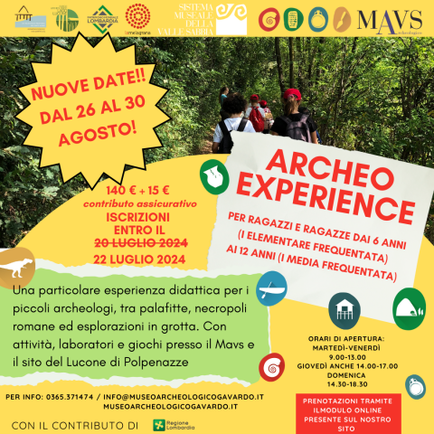 Le attività che prevedono percorsi didattici, laboratori esperienziali, esperienza di scavo simulato, visite, giochi tematici anche in inglese, momento compiti, si svolgeranno presso il MAVS, l’area archeologica del Lucone di Polpenazze ed esplorazione in grotta.