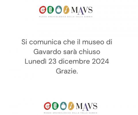 Si avvisa che il Museo di Gavardo rimarrà chiuso lunedì 23 dicembre. Grazie