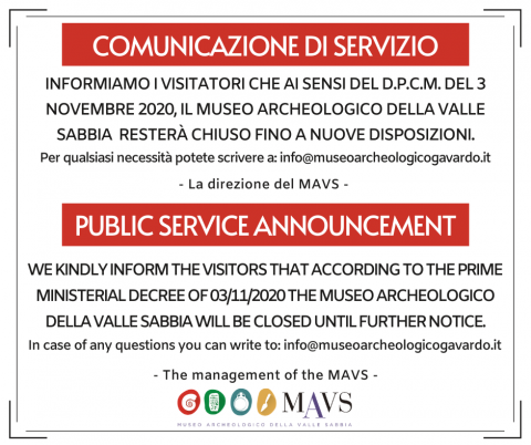 Ai sensi del D.P.C.M. del 3 novembre 2020, il Museo Archeologico della Valle Sabbia resterà chiuso al pubblico fino a nuove disposizioni.