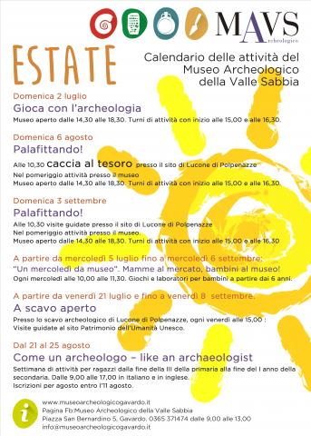 Dal 21 al 25 agosto Come un archeologo – like an archaeologist Settimana di attività per ragazzi dalla fine della III della primaria alla fine del I anno della secondaria. Dalle 9,00 alle 17,00 in italiano e in inglese. Iscrizioni entro l'11 agosto.