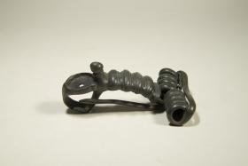 in bronzo, Fibula di tradizione gallica con larghe coste modanate con decorazione a fascia di trattini. La testa della staffa non conserva il perlone decorativo di materiale deperibile (pasta vitrea colorata, ambra, ecc.). Variante più tarda di fibula di produzione valsabbina diffusa essenzialmente lungo il bacino del fiume Chiese e suoi dintorni. Seconda metà I sec. d. C. da Dos de la Roccheta di Sabbio.