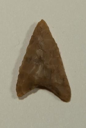 punta foliata a base semplice concava con ritocco bifacciale coprente. ipotesi di impiego: queste punte di freccia potevano essere usate sia per la caccia che per la pesca.
