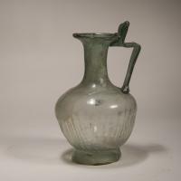 Brocca in vetro con corpo decorato a costolature verticale e ansa a nastro, databile al II secolo d...