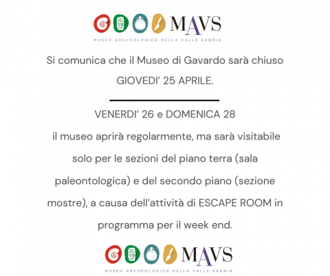 Si comunica che il Museo di Gavardo sarà chiuso GIOVEDI’ 25 APRILE.