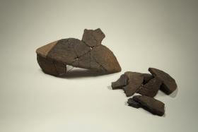 Frammenti di vaso biconico carenato con decorazione a fasce di trattini obliqui impressi a “cordicella” entro linee orizzontali di impressioni dello stesso tipo, rinvenuti insieme alla fibula. Databile al IX sec. a. C. Probabile contesto funerario. Monte Magno di Gavardo, fondo Guseo.