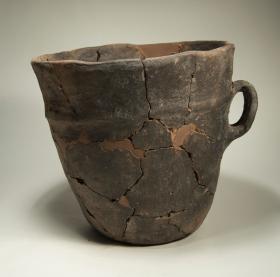 Grande boccale troncoconico con ansa ad orecchio e cordone plastico liscio. Recipiente probabilmente multifunzione.